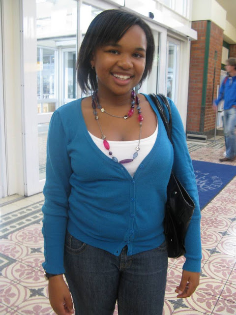 I met these girls on Long Street yesterday after having a fabulous lunch with my gorgeous friend Nina, who I've talked about before. I really wasnt thinking 'blog subjects!' but something woke me up from my reverie and pointed out the cute and sweet students Linda and Chwayica (isnt that a beautiful name - pronounced 'tswy-dah') Linda also has the longest degree name I have ever heard of to study. BA Social Sciences and PPA, Film and Media and Industrial Soc. I mean what the? Her dress is from Mr Price (Linda, left, blonde braids) Simple.